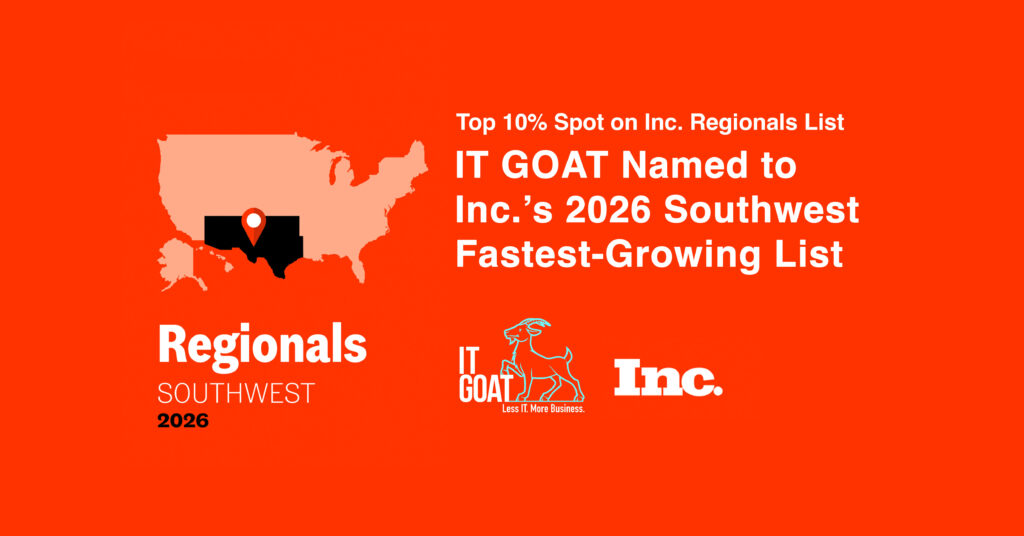 From over 950 high-growth companies, IT GOAT secured a top 10% position on Inc.’s Regional list. The region includes Arizona, New Mexico, Oklahoma, and Texas.