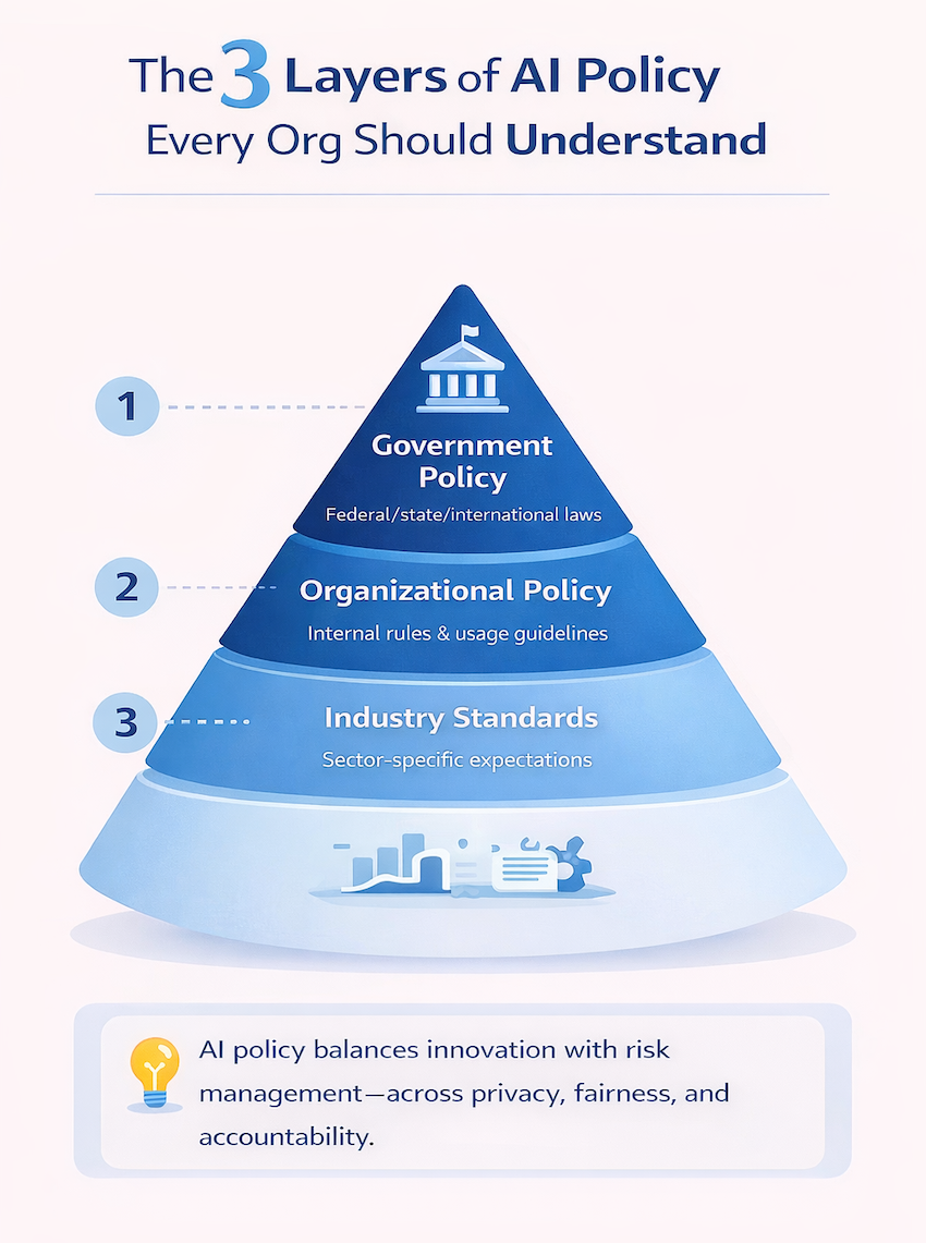 You’ll encounter AI policy at three distinct levels: