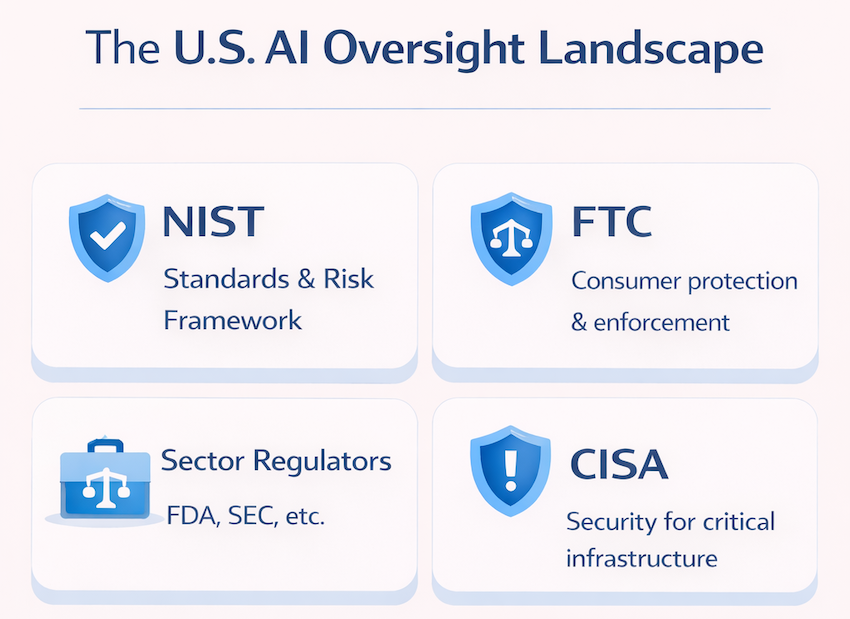 No single agency has comprehensive AI authority, which means organizations often face requirements from multiple sources simultaneously.
