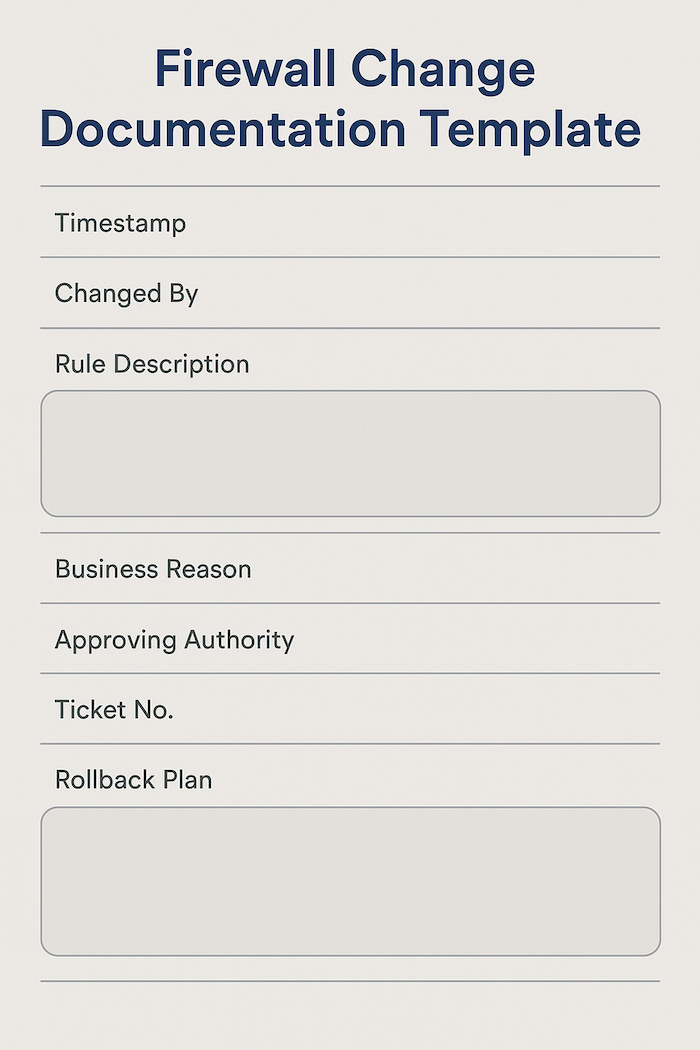 Document every firewall change using a standard format that captures the date, rule description, business reason, and approving authority. Include ticket numbers linking to your help desk system and maintain rollback plans for each change. This documentation proves essential during audits and helps future administrators understand why rules exist.