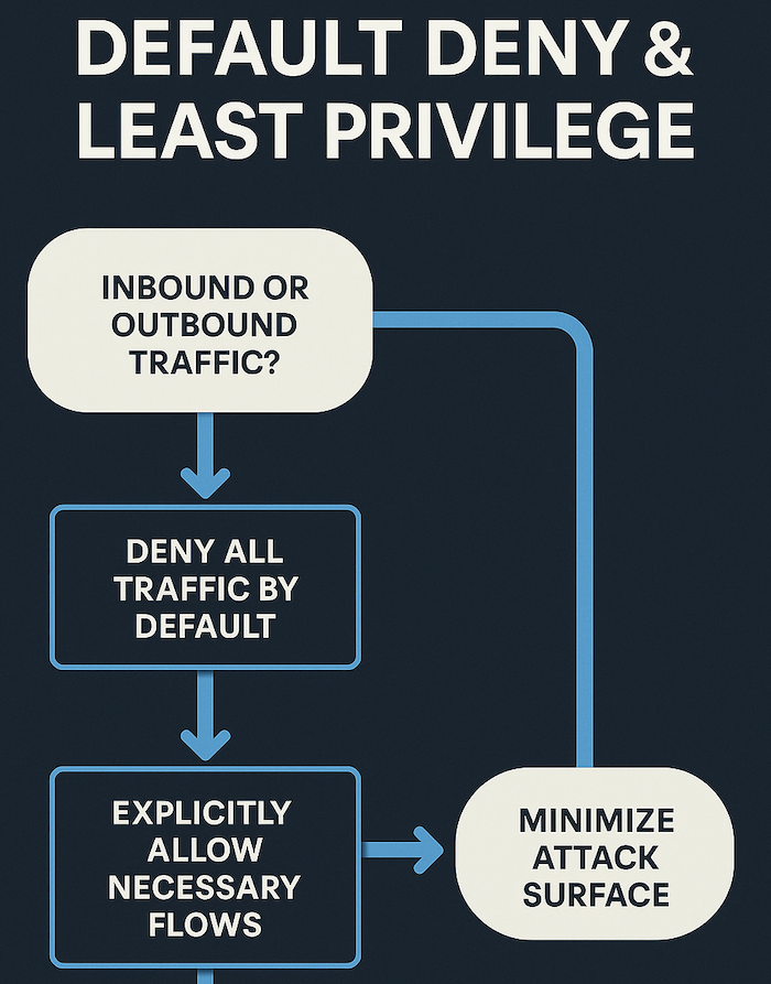 Starting with a deny-all stance forces you to explicitly allow only necessary flows. This approach dramatically reduces your attack surface compared to allowing everything and trying to block the bad stuff implementing the principle of least privilege at the network level. For outbound traffic, restrict connections to essential services and destinations rather than giving blanket internet access.