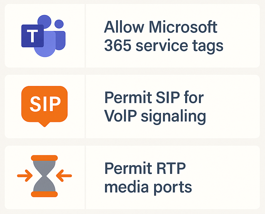 Allow SIP signaling to your phone provider’s servers, typically using port 5060 for unencrypted or 5061 for encrypted signaling. Permit RTP media on the UDP port ranges your vendor specifies, often something like 10000–20000, but only to your provider’s documented addresses. Apply Quality of Service (QoS) prioritization to prevent voice packets from competing with large file transfers.