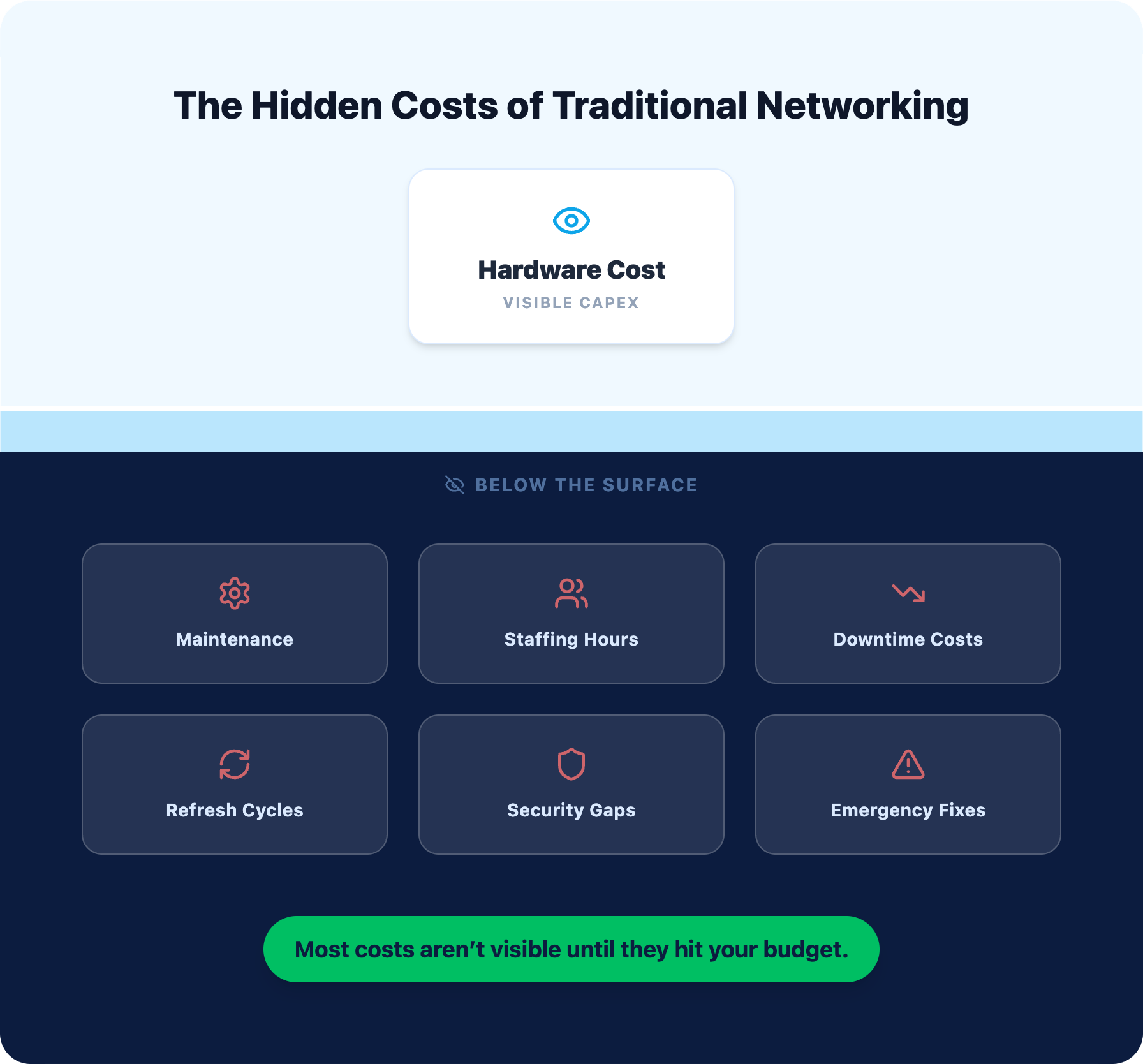 Budgeting for network infrastructure used to mean large upfront purchases followed by years of unpredictable maintenance costs. NaaS flips that model by delivering enterprise-grade networking through predictable monthly subscriptions—even when the equipment sits in your own building.