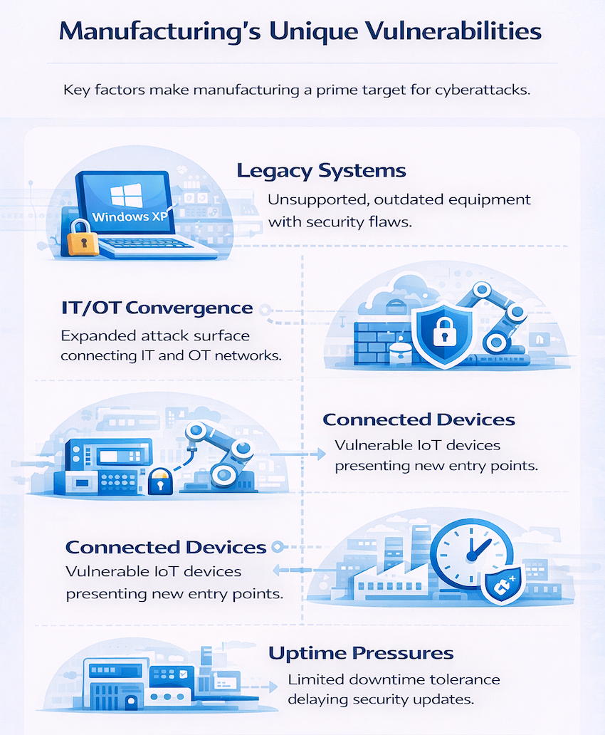 Manufacturing environments face distinct challenges that other industries simply don’t encounter. Understanding where weaknesses exist helps explain why the sector experiences disproportionate attack rates.