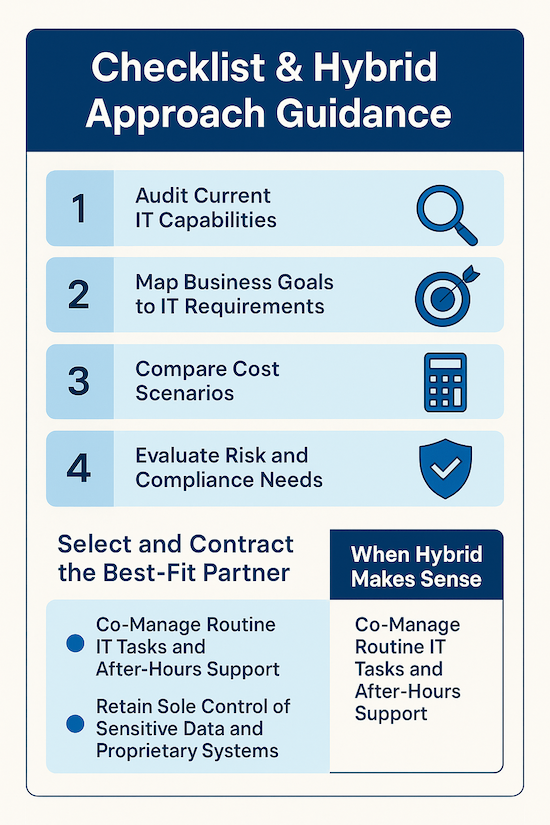 Combining both models optimizes cost, coverage, and expertise by leveraging each model’s strengths. Many organizations find co-managed IT arrangements deliver better outcomes than pure in-house or fully outsourced approaches.