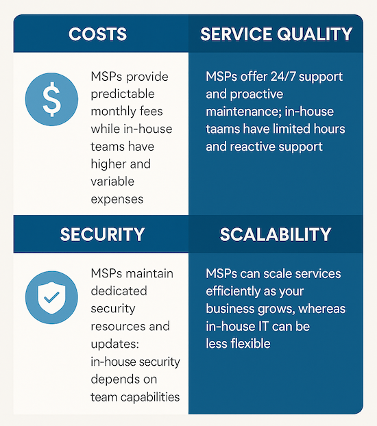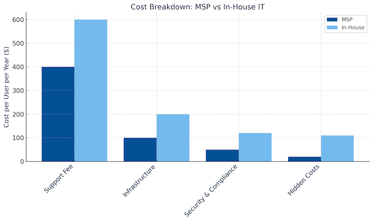 Total cost of ownership extends far beyond salaries or monthly fees. MSPs offer predictable monthly costs, while in-house teams carry variable expenses that fluctuate with headcount, turnover, and infrastructure needs.