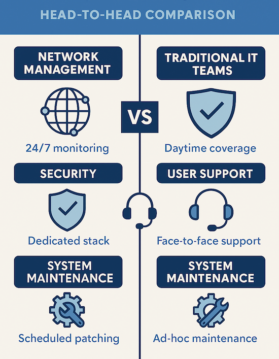 Network management differs significantly between models. MSPs provide proactive monitoring with standardized configurations through 24/7 Network Operations Centers, while in-house teams typically offer daytime coverage with custom configurations and manual oversight.