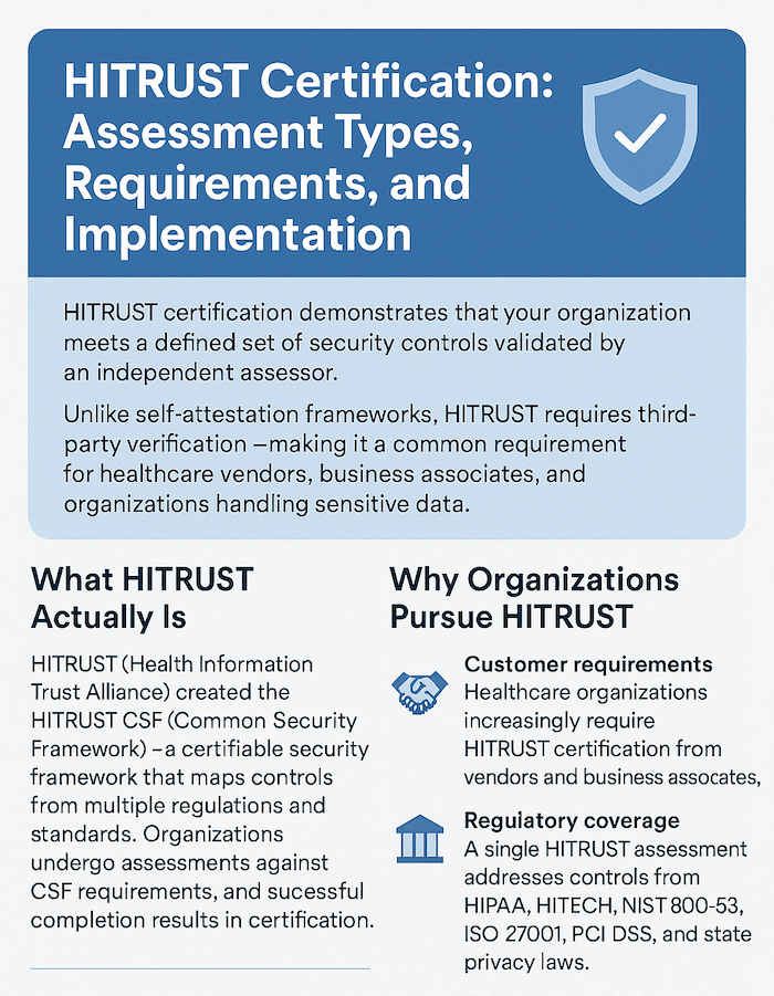 The framework consolidates requirements from HIPAA, NIST, ISO 27001, PCI DSS, and other standards into a single assessment. This guide covers the three certification types, what assessments actually evaluate, realistic timelines and costs, and practical steps for achieving certification.