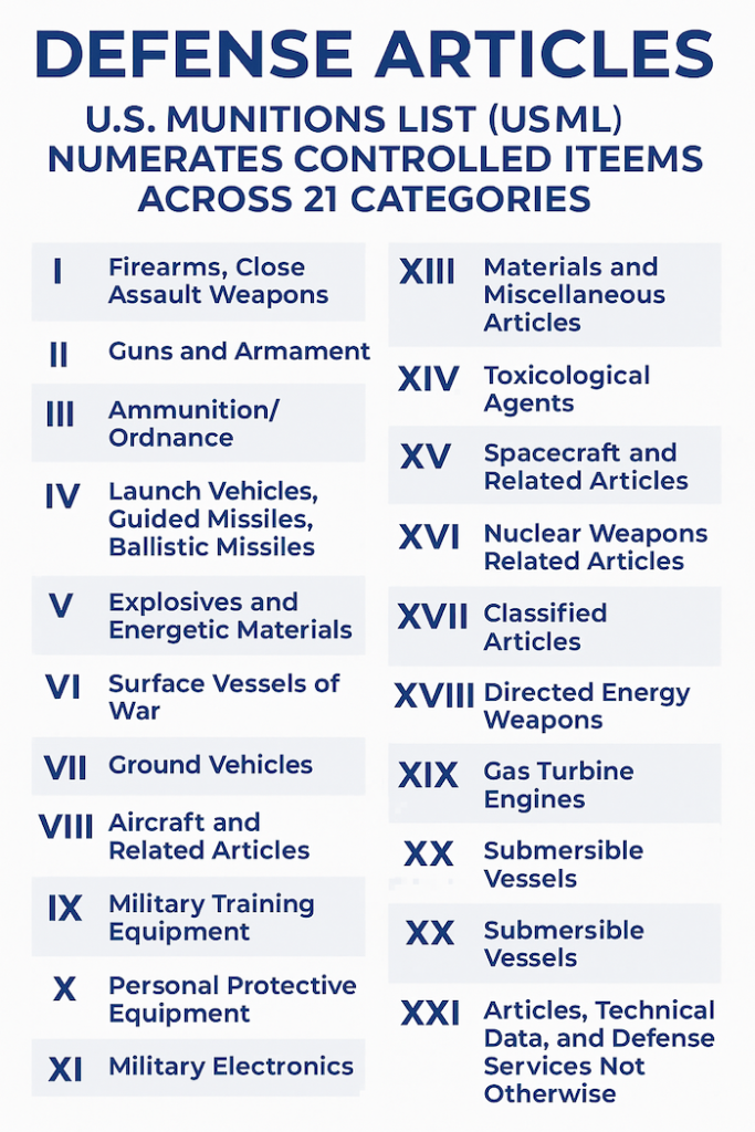 Defense articles are items specifically designed, developed, configured, adapted, or modified for military application. The U.S. Munitions List (USML) enumerates controlled items across 21 categories.